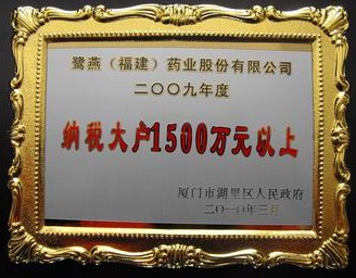 2010年3月23日,廈門湖里區(qū)人民政府召開2009年度納稅先進(jìn)企業(yè)表彰大會(huì),并公布2009年度納稅先進(jìn)企業(yè)名單,鷺燕集團(tuán)核心成員企業(yè)鷺燕(福建)藥業(yè)股份有限公司光榮登榜。自2006年以來鷺燕集團(tuán)已連續(xù)四年獲得納稅大戶(1000萬以上)榮譽(yù)稱號(hào)。
